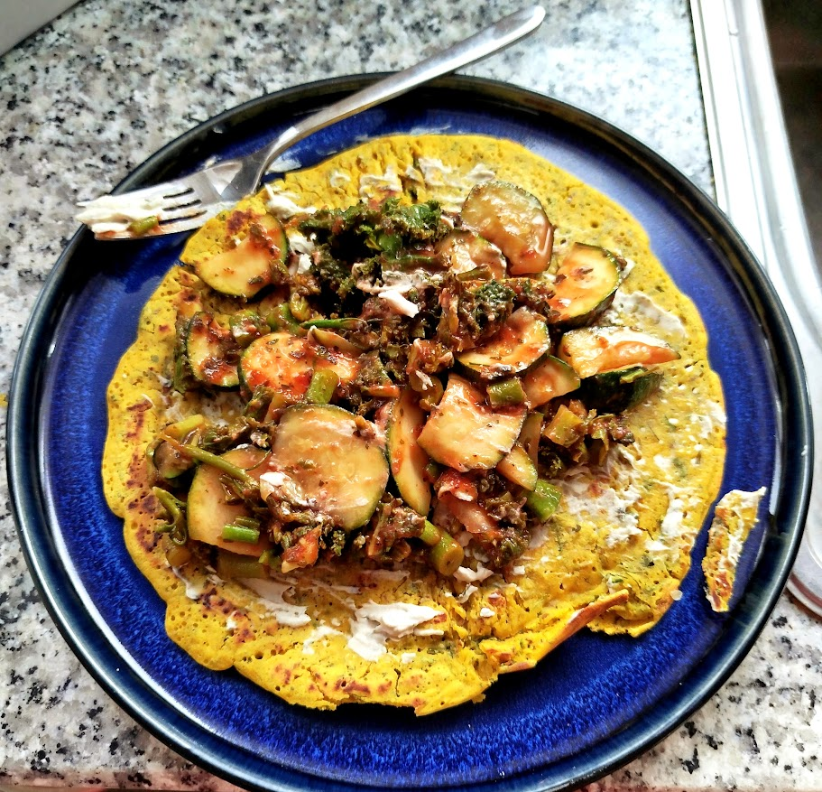 In India, a popular savoury dish is the besan cheela (chickpea pancake), which typically contains chopped onions and/or other veggies. I decided to do a twist on this dish, instead loading the veggies in the form of a stifry on top, to get a pizza kind of dish. I cooked a stir-fry separately, with kale, zucchini, and carrots, and the chickpea pancake separately (in the dough, I used chickpea flour, water, nutritional yeast, salt, and turmeric powder). I then put on a layer of the New Roots garlic vegan cheese spread (you can also use home-made cashew cream) on the chickpea pancake (cheela) and then loaded the stirfry on top. This can then be enjoyed as-is or folded into a wrap structure.