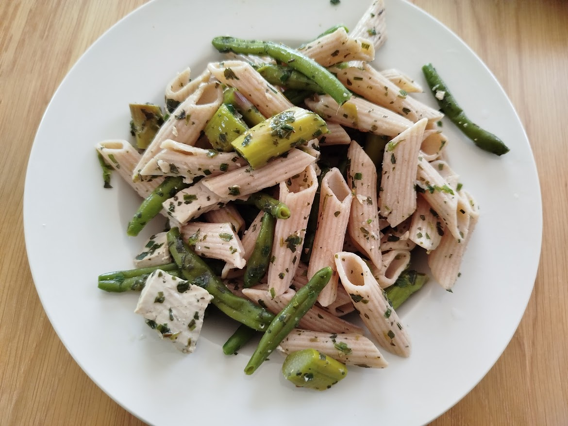 By far, my favourite pasta recipe. It is really flavourful and delicious, and using a sauce is completely optional, I prefer it without. Making this just involves boiling pasta as usual, in al dente style, and making a separate stir-fry with coarsely chopped asparagus, green beans and tofu, flavoured at the end with fresh/dried basilikum, oregano, and rosmarin. The pasta is then simply mixed with the stir-fry. If you want a sauce for extra creaminess, use cashew cream, and/or a tomato-based sauce.