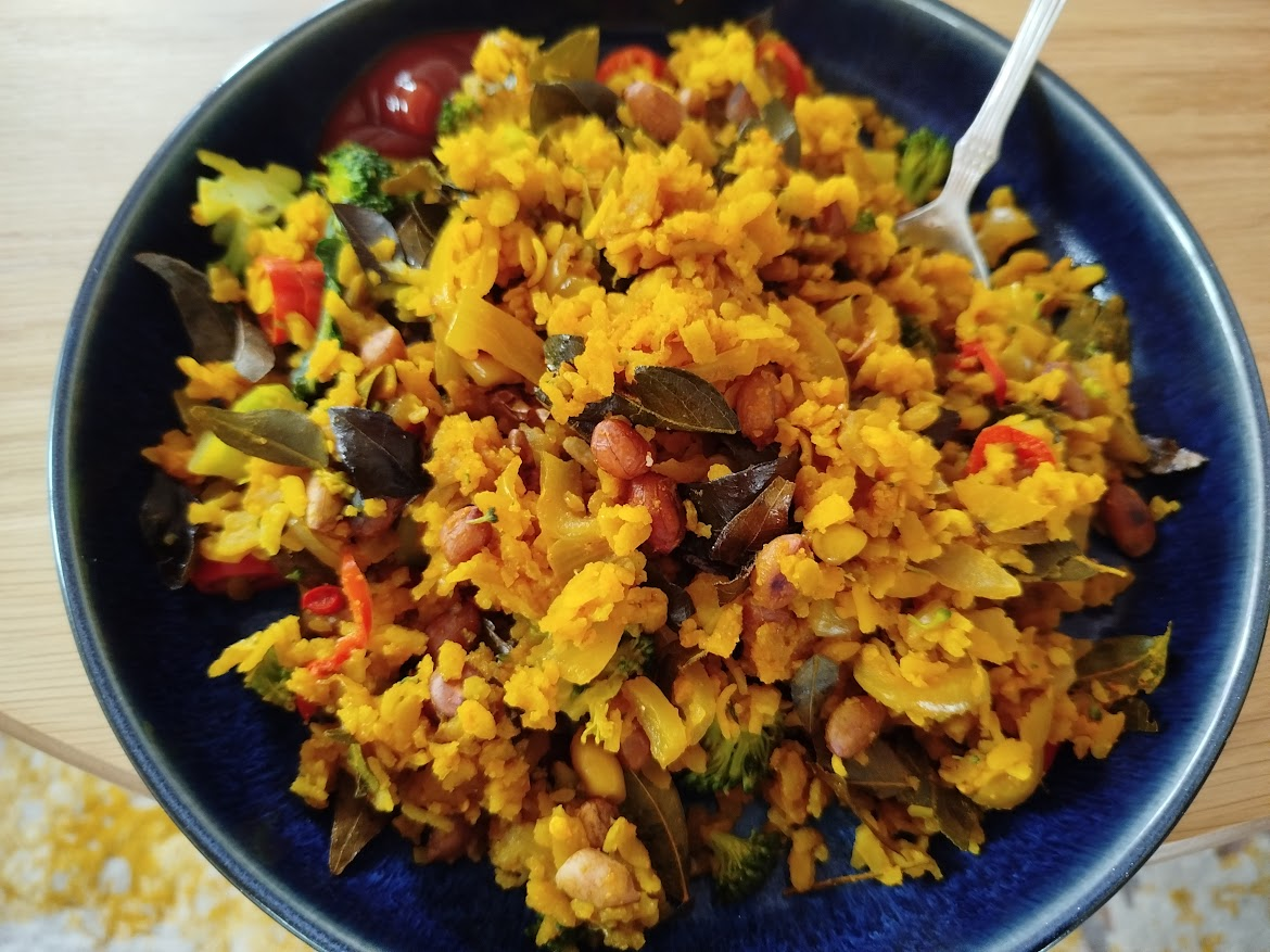 Poha is a classical Indian favourite breakfast, comprising a flavourful beaten rice dish with mustard seeds, onions, potatoes, roasted peanuts, green chillis, curry leaves, and spices. I decided to jazz up my poha a step further, by adding some florets of broccoli to go along. I first popped some black mustard seeds, browned some green chillis and chopped onions in the same pan, and then added some water, finely chopped steamed potato pieces, and some small broccoli florets, and cooked unil they softened about 70%. When this was done and the water was boiling, I finally added the beaten rice, turmeric powder, and roasted peanuts. The heat then needs to be turned off immediately to avoid the rice getting too soggy. The remaining water should be just enough for the rice to absorb and become fluffy. Leave the pan on the (switched off) heating plate for a while. Note that beaten (flat) rice has been steamed already, so it cooks almost instantly.