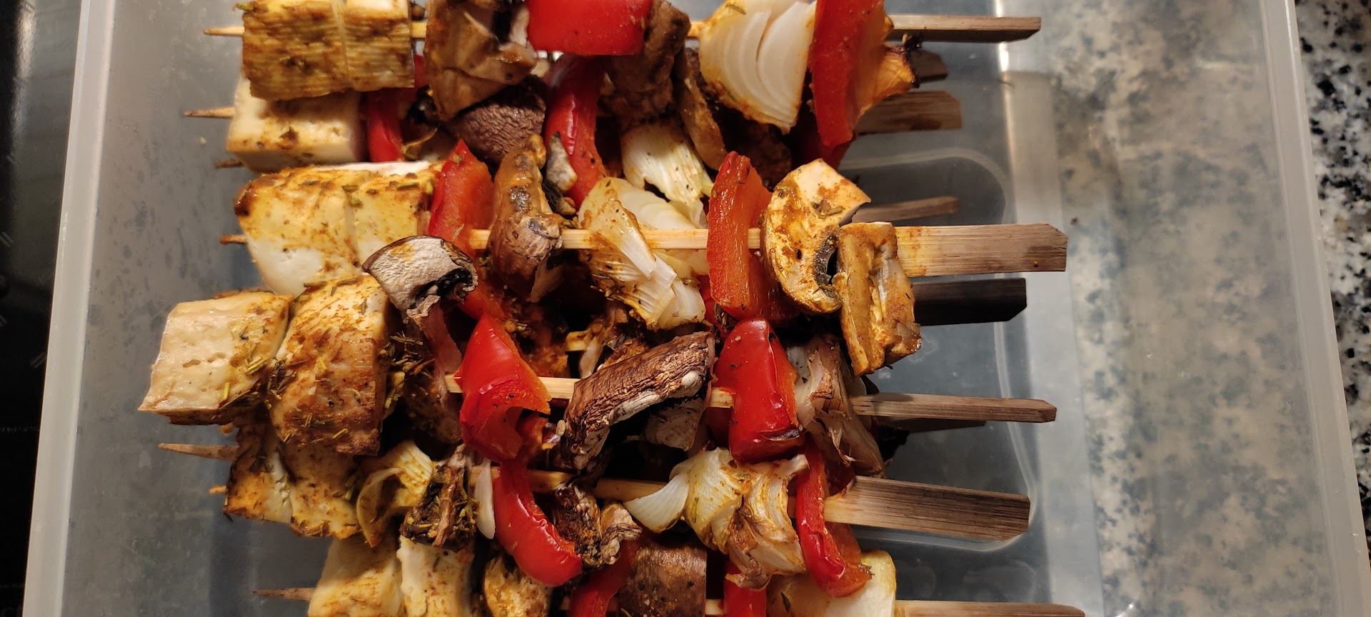 When summer arrives, so does barbeque season. I was never a fan of meat replacements, so I came up with this recipe for skewers, which can be made in the oven or roasted on a barbeque (maybe? I never tried). It’s pretty simple, I chopped up onions, tofu, and mushrooms into big pieces and loaded them onto store-bought wooden skewers. I then made a separate sauce to coat them with tahini, lemon juice, vinegar, salt, and some store-bought spice mix for tofu. One could use liquid smoke or barbeque sauce for that smoky flavour, but I don’t like it, so I did not. I then covered the skewers with the sauce and baked at around 180 degrees for about 30-40 minutes, reversing the plate direction in the middle to even out the heat.